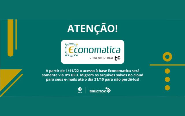 fundo verde  no tom do logo da base Economatica com o logo centralizado e o alerta: "Atenção! A partir de 1/11/22 o acesso à base Economatica será somente via IPs UFU. Migrem os arquivos salvos no cloud para seus e-mails até o dia 31/10 para não perdê-los!"