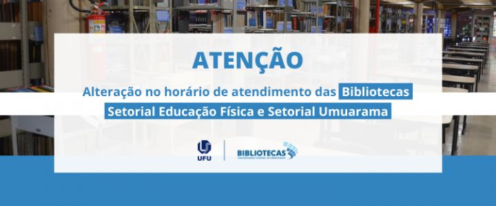 As Bibliotecas UFU informam alteração no horário de atendimento das Bibliotecas Setorial Educação Física e Setorial Umuarama de 12 a 23/9/22.