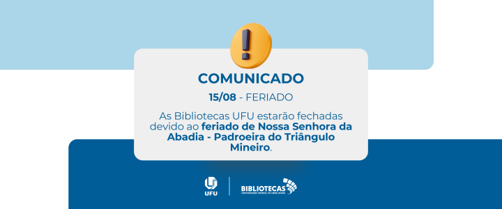 As Bibliotecas UFU estarão fechadas no dia 15/08, próxima sexta-feira, devido ao feriado de Nossa Senhora da Abadia - Padroeira do Triângulo Mineiro.