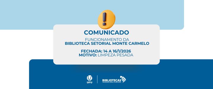 Comunicamos que a Biblioteca Setorial Monte Carmelo estará fechada entre os dias 14 a 16/1/2026 (quarta a sexta-feira), para execução dos serviços de limpeza pesada na unidade.